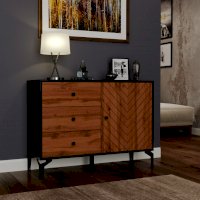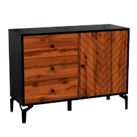 У комода три выдвижных ящика с шариковыми направляющими слева и отделение с распашной дверью на петлях без доводчиков справа. Внутри-полка, выполненная в цвет корпуса и выдерживает нагрузку до 5 кг.