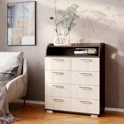 Комод Стандарт №1 отличается своей практичностью. Наряду с выдвижными ящиками, он имеет открытую полку, расположенную сверху, значит у вас появится дополнительное место для хранения вещей.