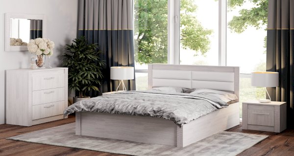 Двуспальная кровать Монако – это современная модель для комфортного сна и отдыха. Изделие выполнено из ЛДСП в приятном цвете ясень белый. Изголовье кровати имеет мягкие вставки и декоративную отделку. Модель оснащена подъемным механизмом, в нишах можно хранить сезонные вещи или постельные принадлежности.