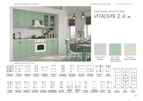 Модульный кухонный гарнитур Италия (Террикон) - за 65 462 руб. в Бердянске. Купите на сайте berdyansk.onlinemarketmebeli.ru или по телефону 8(800)505-30-63 уже сегодня! Уточнить наличие, комплектацию, актуальную цену можно бесплатно у менеджера ежедневно. Закажите Модульный кухонный гарнитур Италия (Террикон) до конца акции! Доступна покупка в кредит, рассрочку. Доставим со склада или на заказ.