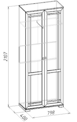 Распашной платяной шкаф с выдвижной штангой для одежды. Благодаря своей маленькой глубине (400 мм) разместится в небольшой по габаритам комнате, не заняв много места. На верхней полке можно хранить аксессуары и коробки с головными уборами.