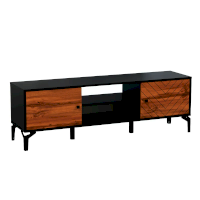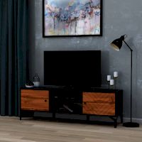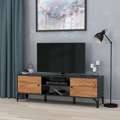 Тумба под ТВ «Лофт» симметричная по своей конструкции. По бокам два отделение за распашными дверями на петлях без доводчиков. Посередине - открытое отделение с полкой. Полка выполнена в цвет корпуса и выдерживает нагрузку до 5 кг.