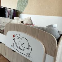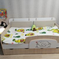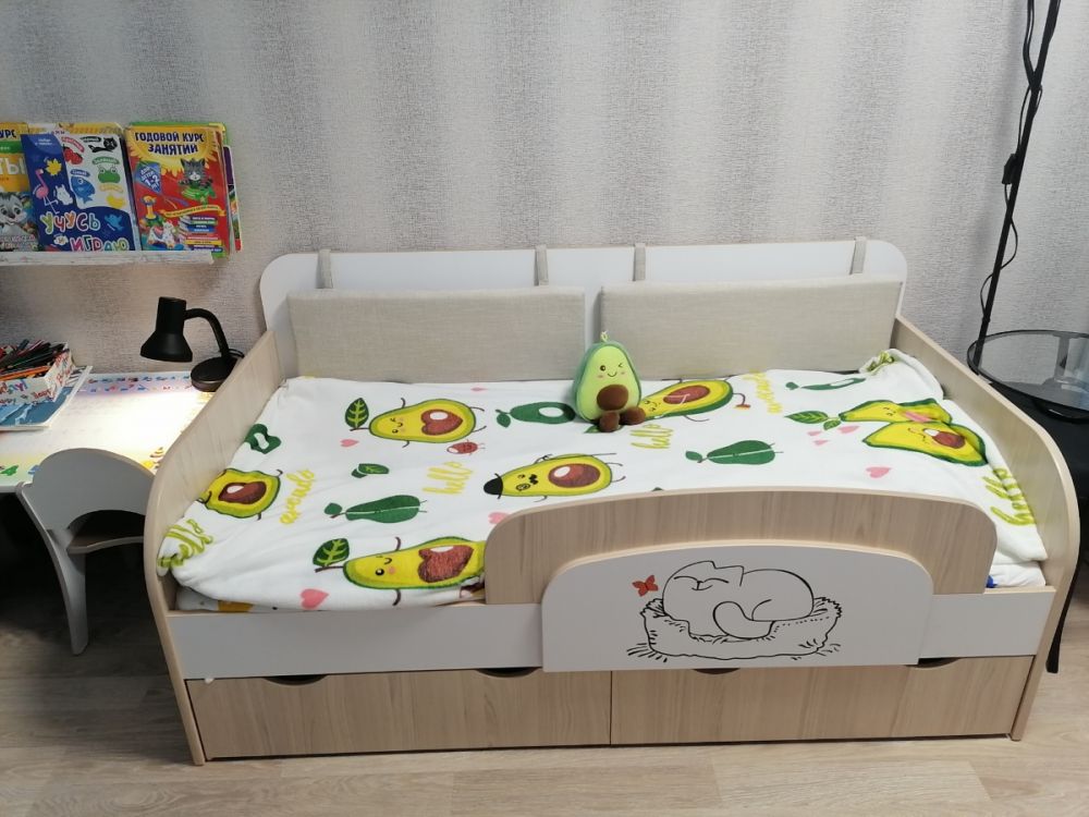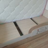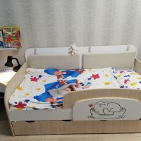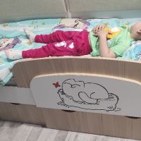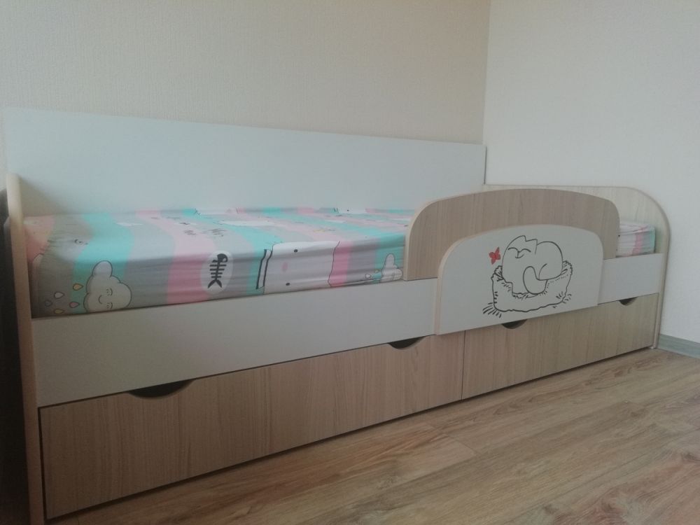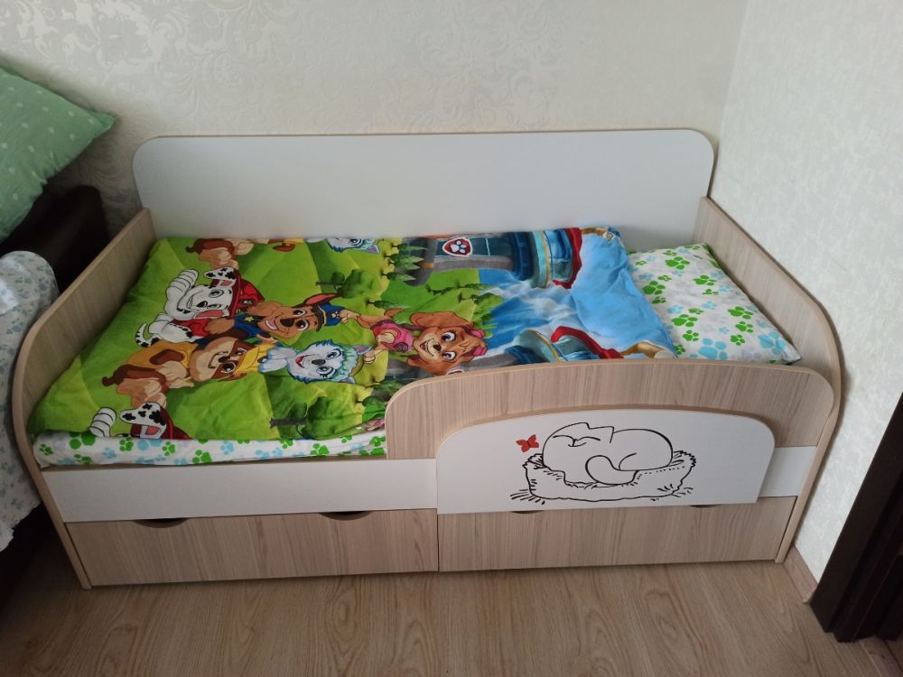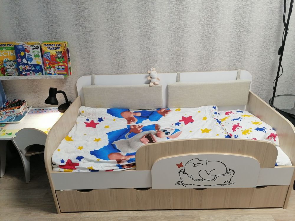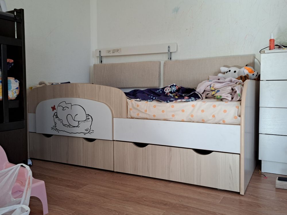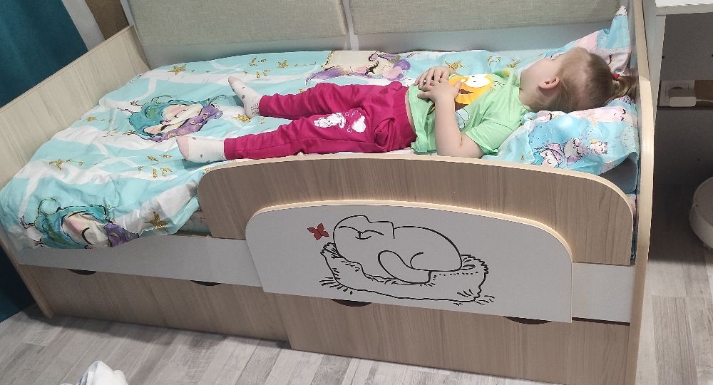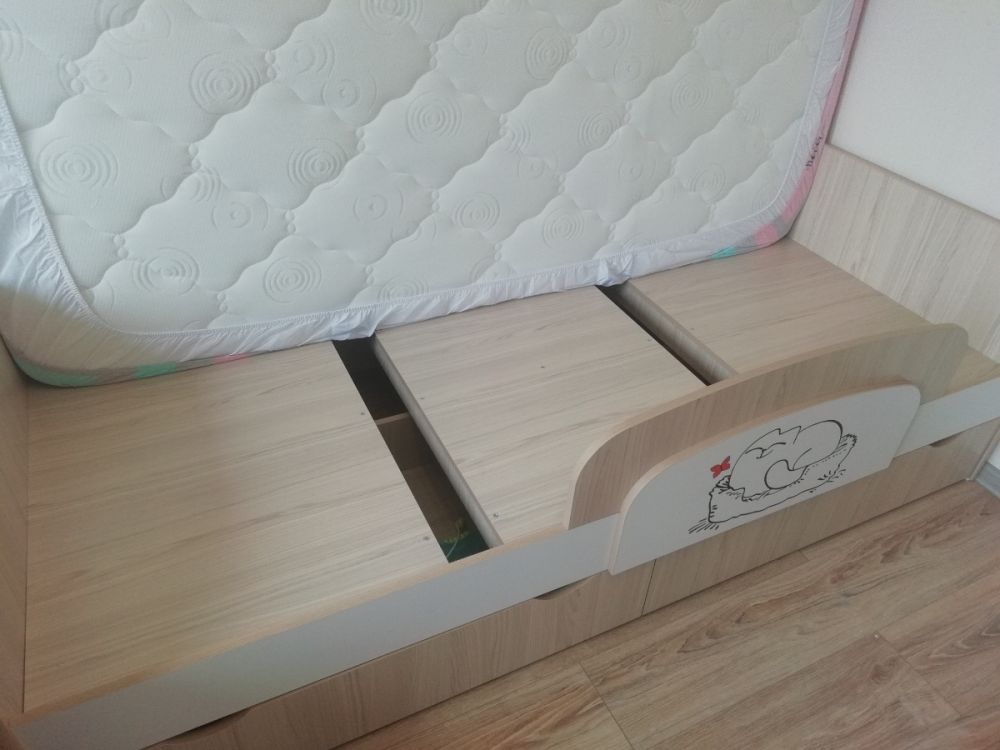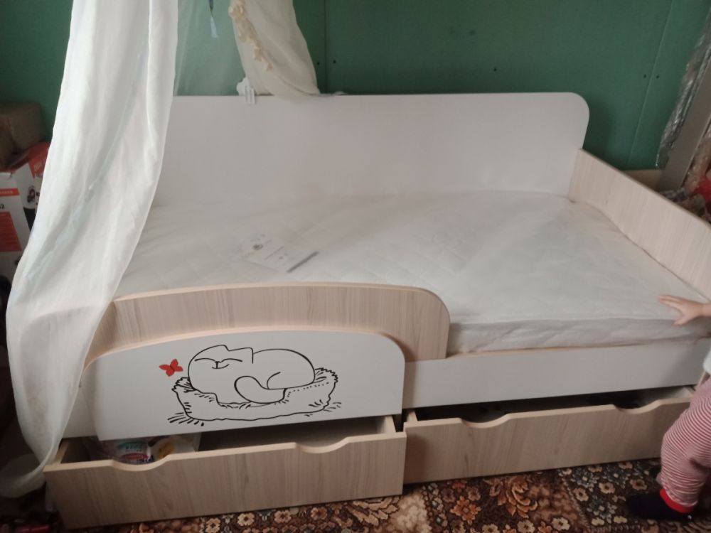 Доброго времени суток! Хочу оставить отзыв о нашей кровати. Покупали ребёнку, 3 года. В использовании неделю, недостатков не увидели. Очень порадовала качественная упаковка. Деффектов не было. В сборке заняла около 2х часов времени. Вместительные ящики с крепкими качественными полозьями, удобный съёмный бортик-регулируется по любой удобной стороне, качественно сшитые чехлы на липучках, легко можно снять и постирать. Большим плюсом служит то, что кровать не реечная, а состоит из 3х досок - это предаёт кровати крепость и устойчивость. Ножки против скольжения тоже были установлены. Единственный недостаток, не связанный с кроватью, это её доставка. Не смогли договориться на удобное время, поскольку я работаю и забрать её утром получилось с помощью других людей. В общем мы очень довольны покупкой, спасибо большое продавцу! Процветания и успехов!