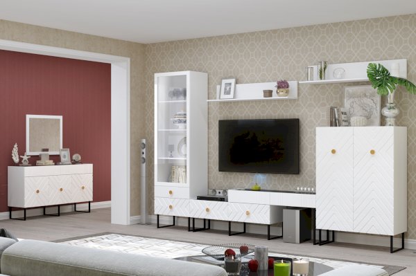 В конструкции модуля предусмотрено отделение для открытого хранения красивой посуды и декоративных предметов, а также два выдвижных ящика, где можно разместить различные мелочи.