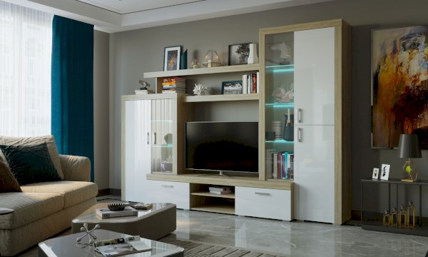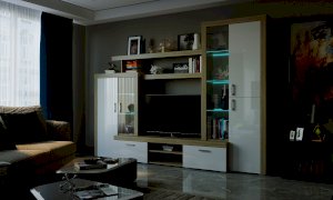 Гостиная "Орландо" с 2-мя ящиками на роликовых направляющих. Корпус гостиной обрамлён профилем MDF оригинальной формы. Опционально возможна установка светодиодной подсветки для стеклополок в витринах гостиной.