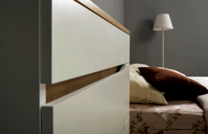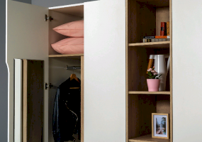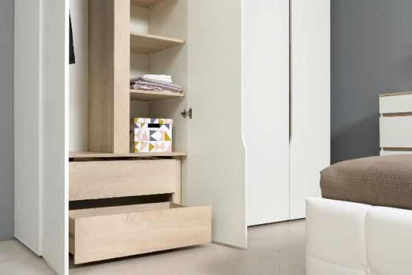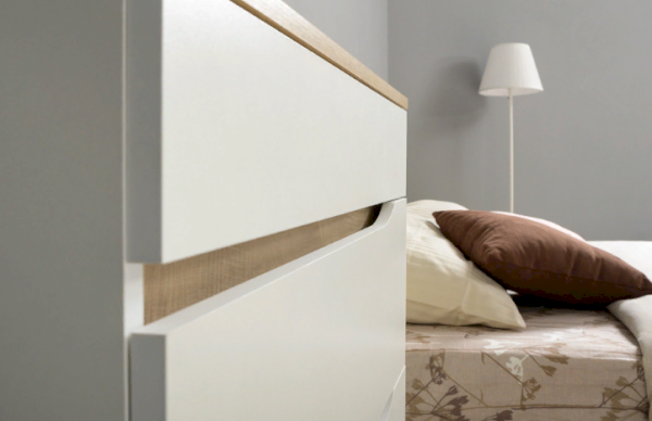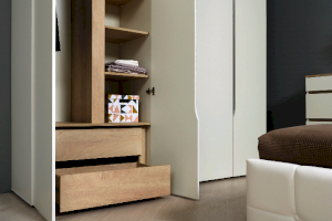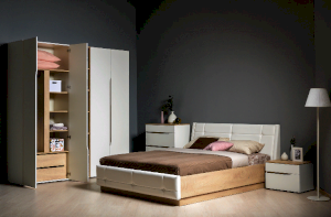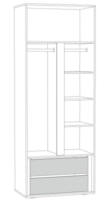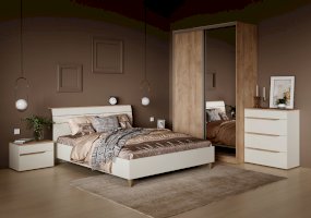 Это современное, практичное и уютное решение для спальни. Мягкое изголовье кровати установлено с небольшим наклоном, что даёт возможность не только лежать, но и комфортно сидеть, как на диване. Подъёмный механизм обеспечивает удобный доступ к вместительной системе хранения. Все изделия установлены на регулируемые опоры, что значительно упрощает установку и позволяет компенсировать неровности пола. Лицевую фурнитуру заменяет стильный вырез, за которым видно древесный декор корпуса. Вырезы делают внешний вид изделий асимметричным, что делает композицию современной и динамичной. Стеллаж и шкафы могут быть собраны в единую компоновку, давая возможность собрать в интерьере стильную шкафную группу. Наполнение шкафа может собрано на любую сторону, два выдвижных ящика скрыты за распашными фасадами, на обратной стороне которых размещается зеркало.