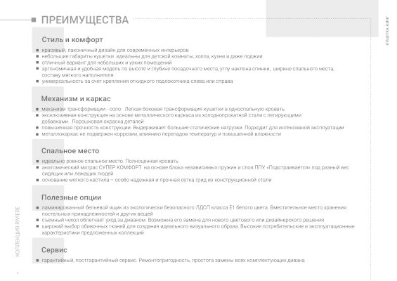 Максимально компактные размеры кушетки как в разобранном, так и в собранном виде, позволяют кушетке Кинг поместиться в помещения практически любого размера.