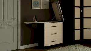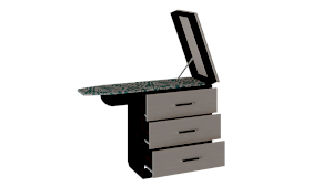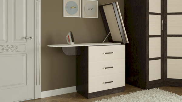 Комод выглядит компактно, он имеет 3 вместительных выдвижных ящика, которые позволят использовать 100% внутреннего пространства. Главное преимущество комода – встроенная гладильная доска, она находится внутри откидной крышки, благодаря чему комод выглядит компактно и зрительно не загромождает комнату.