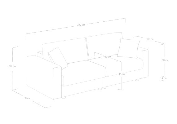 • В комплектацию дивана входят две декоративные подушки, которые позволят корректировать глубину посадки и выгодно дополнят внешний вид дивана