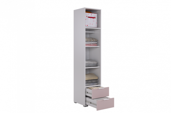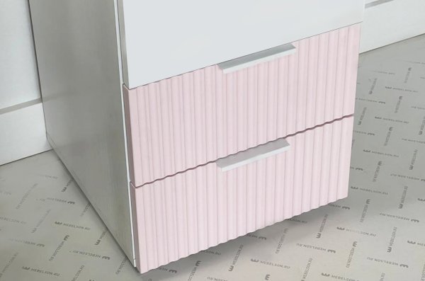 Шкаф изготовлен из прочного материала – лдсп белого дерева, а фасады выполнены из качественного мдф с использованием эмали цвета пудра розовая, добавляющей бархатистость и нежность. Вертикальные полосы на фасаде создают эффектный акцент с использованием фрезеровки.