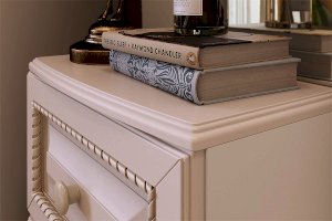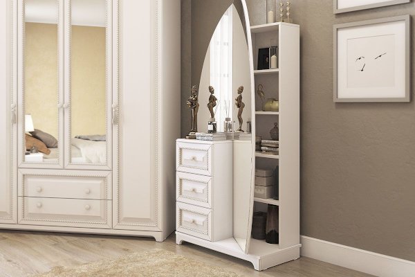 Этот утонченный элемент интерьера украсит собой любую спальню. Совмещает в себе как функционал трюмо, так и вместительного шкафа. Множество скрытых зеркалом полок позволит хранить в нем максимальное количество вещей и аксессуаров. Столешницу из МДФ украшает фрезеровка. На фасады выдвижных ящиков нанесен фрезерованный рисунок.