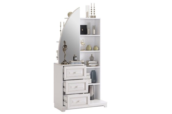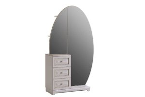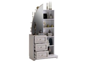 Состоит из: 3-х выдвижных ящиков, зеркала, стеллажа с полками, расположенным за зеркалом.