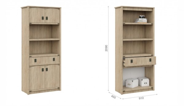 Шкаф - универсальное решение для хранения вещей. Две открытые полки подходят для книг и учебников, декоративных предметов. Декоративные накладки и профиль из МДФ по вертикальным краям закрывают острые края корпуса и придают шкафу более эффектный и надежной вид. Стилизованные металлические ручки MARINE бронзового цвета и декоративные элементы в тон – это изюминка шкафа Валенсия. Идеально компонуется со всеми модулями системы Валенсия.