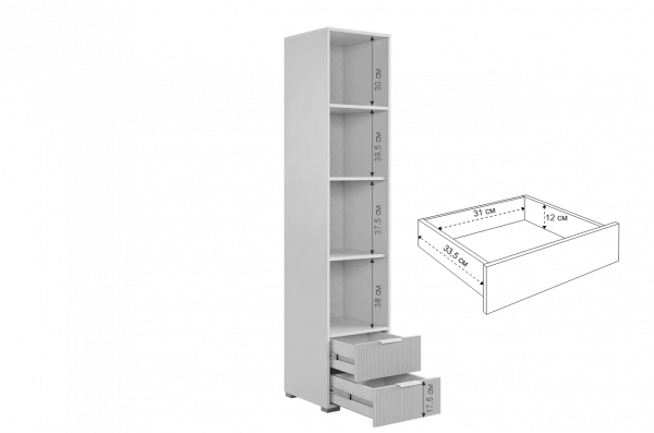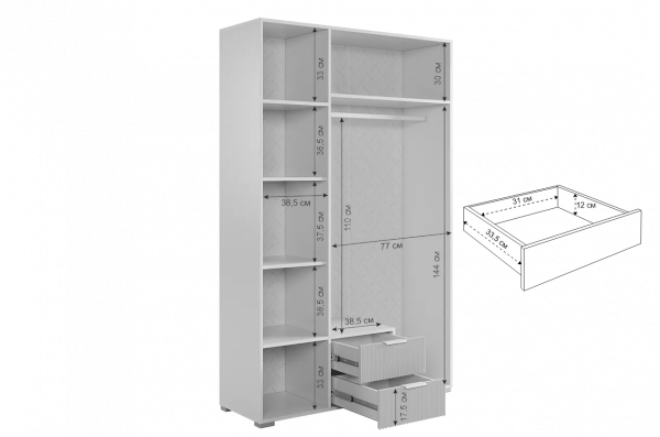Комплектация: Полка 2 шт., трехдверный шкаф, трехдверная антресоль, однодверный шкаф, стол