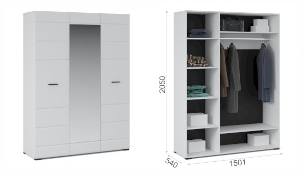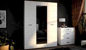 Компактный шкаф Йорк – это решение для небольшой спальни, гостиной или прихожей. Он выполнен в современном стиле – сочетает в себе функциональность и эффектный внешний вид: горизонтальная фрезеровка фасадов, контрастные черного цвета ручки и задняя стенка. Глянцевые белые фасады High Gloss из МДФ и зеркало в полный рост наполняют комнату светом, делают ее просторнее и ярче. Внутри предусмотрены секции для белья и большое отделение со штангой. Идеально компонуется со всеми модулями системы Йорк.