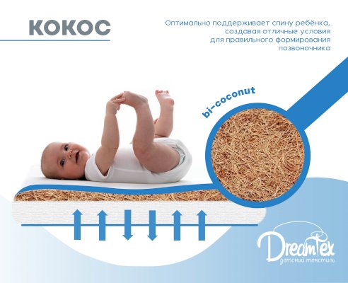 Идеально подходит для малой трансформации кроватки Dreams Smart. Трехслойный матрас позволяет регулировать жесткость спального места для вашего малыша, а натуральные материалы (кокос, латекс) создадут оптимальный ортопедический эффект от эксплуатации.