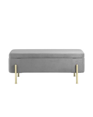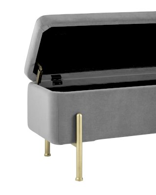 Стильная модель банкетки в обивке из мягкого велюра, прекрасно дополнит интерьер спальни или прихожей. Изящные ножки выполнены из металла в золотом цвете. Под сидением имеется ящик для хранения необходимых вещей. На ножках предусмотрены мягкие накладки, которые предотвращают повреждения напольного покрытия.