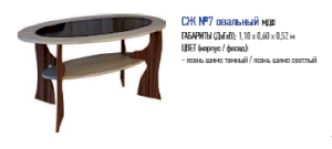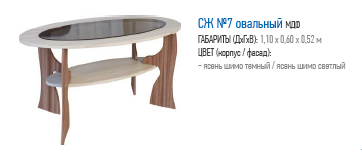 Стол журнальный №7 выделяется из общего ряда товаров. Дело в том, что он полностью лишен острых углов. Каждый его элемент состоит из плавных линий. Овальная столешница и полочка такой же формы закреплены на изящно изогнутых ножках. Обтекаемые формы отлично сочетаются с нежными оттенками темного и светлого ясеня шимо. В целом изделие смотрится гармонично и элегантно.