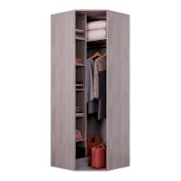 Красивая модель углового шкафа Кимберли выполнена из светлой ЛДСП цвета ясень белый. Фасад распашной дверцы сделан в стиле всей одноимённой коллекции и имеет декоративный фацет и гравировку. Внутри модель разделена на две зоны: для одежды на плечиках предусмотрена хромированная штага, а для других вещей – вместительные полки. Идеальным дополнением является небольшая металлическая ручка.