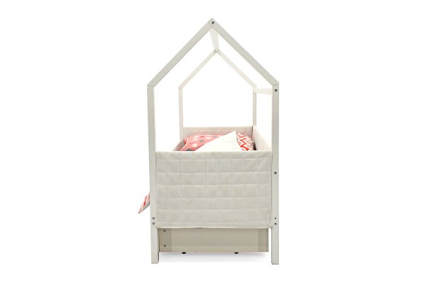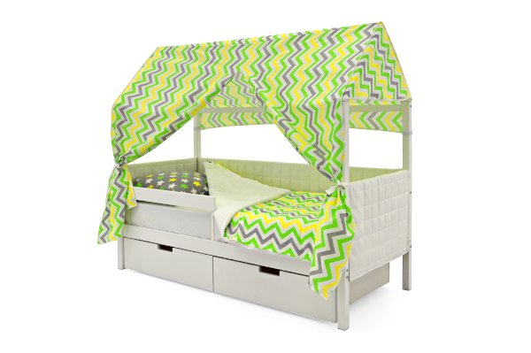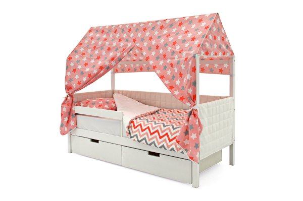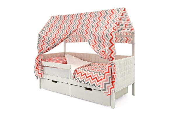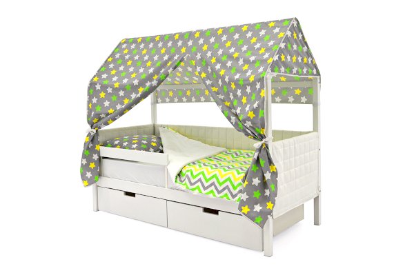 Кровать-домик легко превращается в целый замок для игр с помощью разноцветных тематических игровых накидок. Текстильная крыша на домике создаст ребенку уют и защищенное пространство.