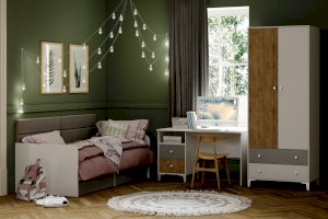 Коллекция  «Морти» сочетает в себе актуальный дизайн и высокую функциональность. Практичная композиция с корпусом в древесных тонах и цветными фасадами станет отличным вариантом для меблировки современной молодежной комнаты.