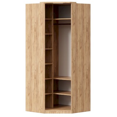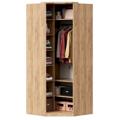 - За распашной дверью две ниши: слева 6 полок шириной 370 мм, расстояние между полками 300 мм, справа 3 полки шириной 951 мм и штанга для одежды
