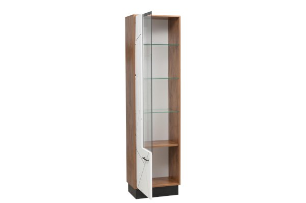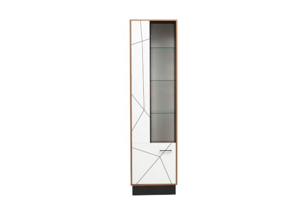 Шкаф-пенал выглядит необычно. В нем всего одна дверца, которая визуально разделена на три части и смотрится как три отдельных элемента: две вертикальные дверцы – сплошная и стеклянная, и один нижний ящик. На самом же деле вы беретесь за ручку и… все три дверцы превращаются в одну и открываются одним движением. Ломаные линии на фасаде – визитная карточка коллекции. Будьте смелее – не бойтесь острых и тупых углов!