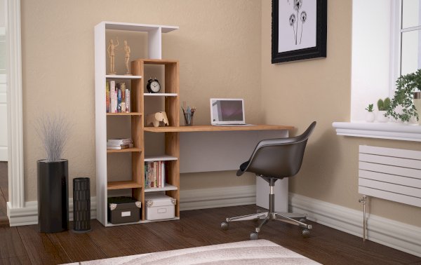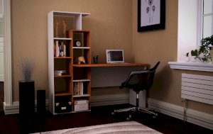 Компьютерный стол, комбинированный с открытой стеллажной системой, позволяет создать удобное и функциональное рабочее место на минимальной площади. На широкой прямой столешнице комфортно помещается ноутбук или планшет; при необходимости за столом можно работать с бумажными документами. Стеллаж заполняется книгами, учебниками, компьютерными принадлежностями, сувенирами. Простые формы оживляются контрастным сочетанием декоров – белый цвет и имитация натурального дерева. Модель предназначена для современных интерьеров.