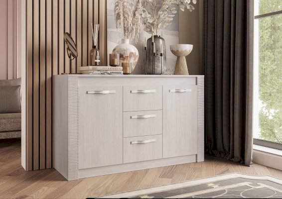Вместительный комод Монако выполнен в сдержанном и элегантном стиле, как и все модели из одноименной мебельной коллекции. Изделие изготовлено в светлом цвете белого ясеня из качественной ЛДСП и имеет декоративные вставки из МДФ. Расположить вес необходимые вещи можно в трех выдвижных ящиках, либо на полках за распашными створками.