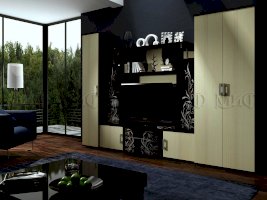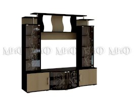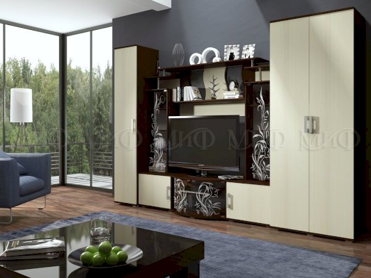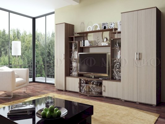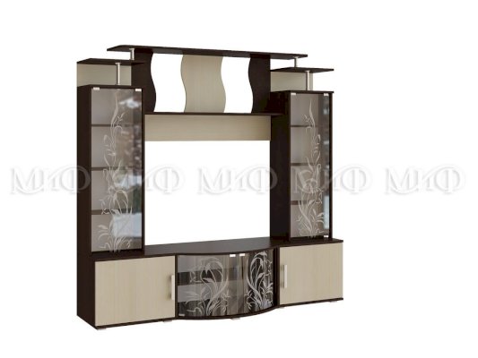 Актуальная модель с большой нишей под TV. Стеклянные дверцы стеллажей декорированы растительным узором. Роскошный вариант для стильного интерьера гостиной комнаты.