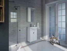 Зеркало в комплекте оснащено шкафчиком с мягкой подсветкой и влагостойким покрытием всей поверхности стекла для защиты от запотевания. Для хранения вещей предусмотрены вместительные полки в тумбе, которые можно варьировать по высоте.