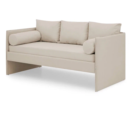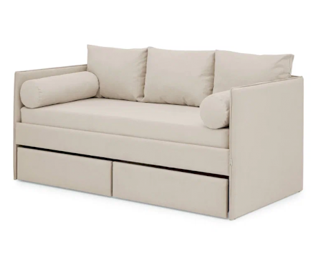 Кровать будет выглядеть как диванчик, если докомплектовать ее подушками, валиками и чехлом.