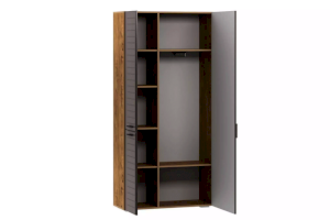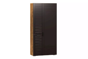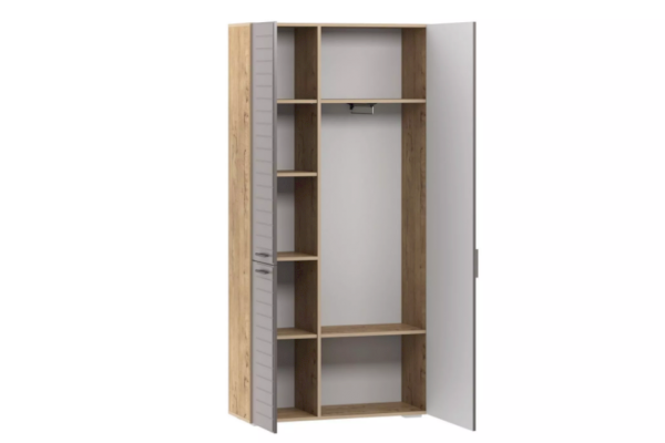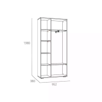 Отдел с выдвижной штангой и двумя полками предназначен для хранения одежды на вешалках-плечиках, а также коробок с обувью. В левой части модуля расположена секция с полками, содержимое которых надежно защитят от попадания грязи и пыли глухие фасады. Наличие двух створок позволит разместить сезонную и повседневную одежду в разных частях данного отдела. Во время поисков понадобится открыть только ту дверцу, за которой находится нужная в данный момент вещь, что предотвратит путаницу.